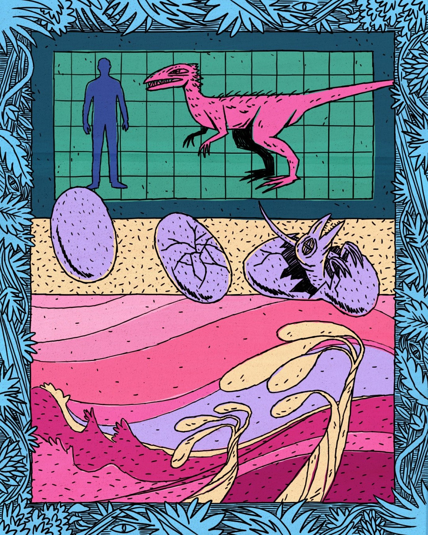 In Zusammenarbeit mit: White Rabbit Studio 2025 Noch ein paar Projekte Getier & Mensch Illustrationen Museum Dinoraum Illustration Dino Studio Illustration • Siebdruck • Sticker